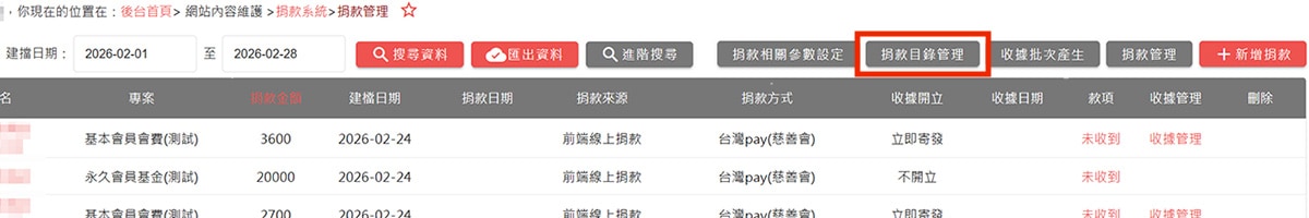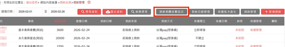 點擊右上角的捐款管理按鈕,進入捐款管理列表。